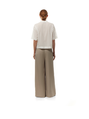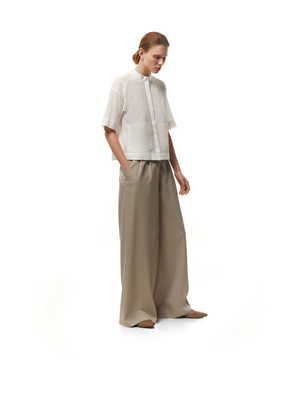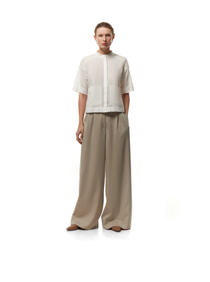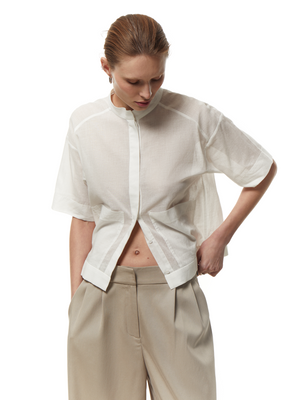 relaxed fit short sleeve shirt. featuring a stand collar and concealed placket for an elevated look. crafted from crisp 100% cotton. detailed with oversized patch pockets.