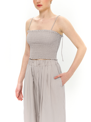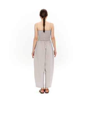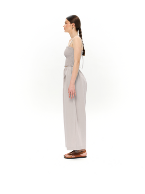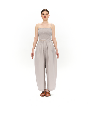 curved wide-leg silhouette drawstring pants. made from a smooth cotton and nylon blend fabric, featuring a natural wrinkled texture. featuring side seam pockets, designed to sit at the waist or higher. featherweight feeling.