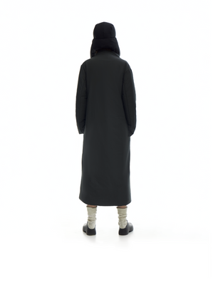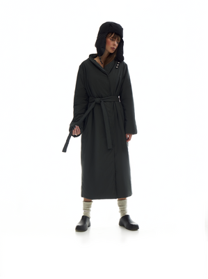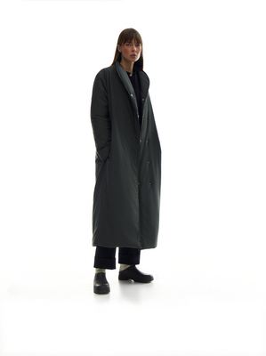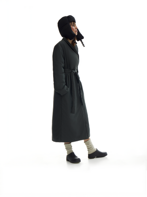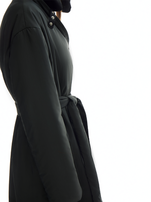 oversized long padded coat, featuring a crossover lapel, pockets, and a removable belt. pressed stud closures. fully lined for added comfort.