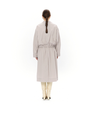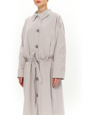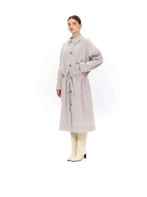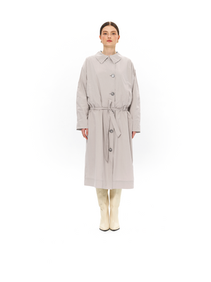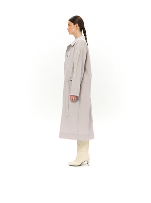 asymmetrical trench coat. featuring in-seam pockets at waist, interior self-tie belt can be adjusted around the waist, and a vent at center back. fully lined for added comfort.